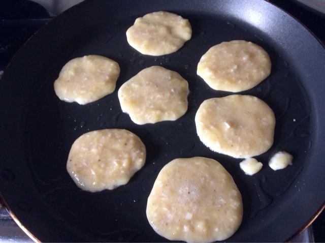 • Once the oil has melted, spoon 1tbsp amounts of the pancake mixture into the pan